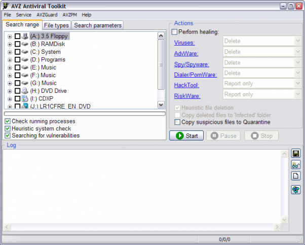 Narzędzie oparte o maszynę Kasperskiego ze stajni rosyjskiej posiadające skaner anty pozwalający na szukanie i usuwanie wirusów / trojanów / spyware / adware / dialerów / riskware. Definicje AVZ można ręcznie aktualizować otrzymując je stąd:klik i umieszczjąc w folderze Base. Bardzo interesujący jest fakt, iż ma on moduł strażnikowy AVZGuard – strażnik ten m.in. może zablokować generowanie plików autorun.inf (infekcje z pendrive). Ma możliwości szukania i killowania rootkitów. Wyposażony w liczne moduły analizujące autostart oraz inne komponenty systemowe. Potrafi wspomóc system skryptowy podobny do techniki CFScript.txt ComboFixa czy Catchme 0.3. Instalacja aplikacji nie jest wymagana, tylko rozpakowujemy i uruchamiamy.Plus to, że nie wygasa też (nie trzeba pobierać w kółko jak inne szczepionki). Linki łatwe do odczytu, chociaż strona po rosyjsku. Można pobrać: avz4.zip (główny program) + avz_se.zip (poszerzony script editor) + avz4thebat.zip (wtyczka do The Bat).