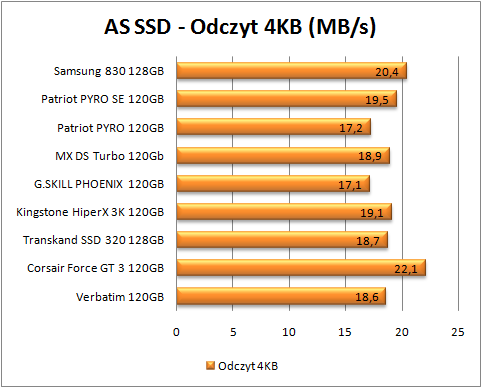 AS SSD jest jednym z najpopularniejszych programów do testowania dysków SSD. Wykorzystuje on niemal niekompresujące się dane. Oprócz standardowych testów zapisów i odczytów danych, na wykresach zaprezentowałem czasy kopiowania (więcej = lepiej).