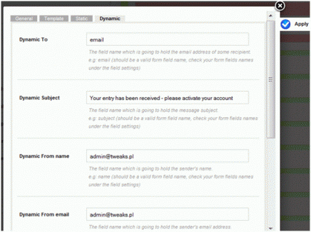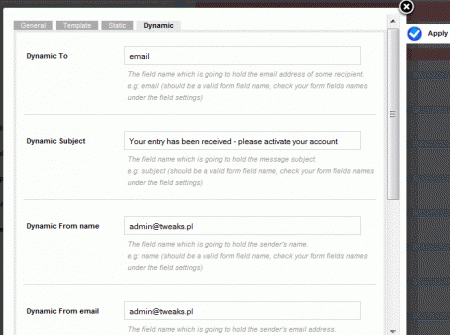 - W zakładce Dynamicwybierz do kogo ma być adresowana zmienna wiadomość (z adresem email lub innymi danymi pobranymi z treści formularza).