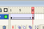 Następnie do 10 klatki dodajmy klatkę kluczową (insert keyframe). Naciśnijmy na klatkę 10 i przeciągnijmy selection tool’em nasz obiekt na drugą część dokumentu.