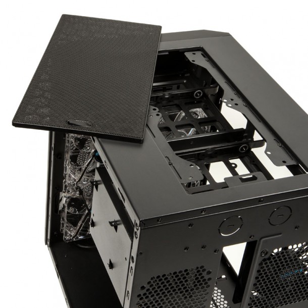 Osoby preferujące chłodzenie wodne mają w obudowie więcej miejsca niż o wiele większych Midi Towerach. W anidees AI-7 jest miejsca na montaż trzech chłodnic typu 240mm i jednej o wielkości 120mm. Za pomocą odpowiedniego opcjonalnego adaptera można jeszcze za obudową zamontować zewnętrzną chłodnicę typu 120/240/360mm. Więcej szczegółów w danych technicznych poniżej..