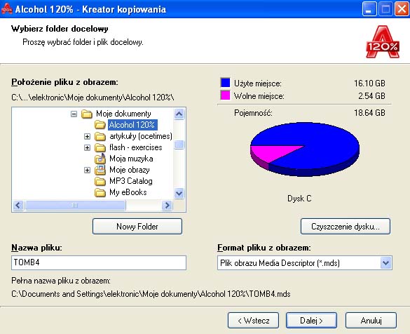 a) W okienku po lewej stronie zaznaczamy folder do którego program zapisze obraz naszego pliku. b) Następnie w lewym rogu wpisujemy nazwę pliku (obrazu). Podana jest również pełna ścieżka do owego folderu. c) Po prawej stronie, znajduje się wykres, z którego możemy odczytać ile obecnie mamy miejsca na którejś z partycji. d) W prawym rogu ustawiamy w jakim rozszerzeniu program ma zapisać obraz pliku na dysku, ale zostawiamy tak jak jest. e) przechodzimy dalej.