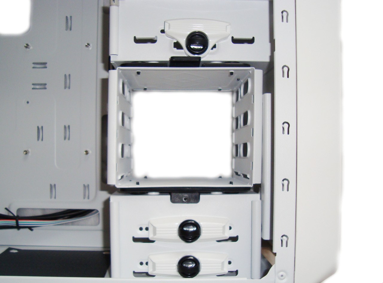 Dyski demontowanej części koszyka montujemy w specjalnych czarnych szynach wykonanych z plastiku. Warto zaznaczyć, że posiadają one gumowe podkładki, które mają za zadanie absorbować drgania wywoływane przez 3,5″ dyski talerzowe.