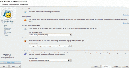 - W ostatnim kroku uzupełniasz wygląd szablonu(header and footer), dostęp do panelu przez autoryzowanych użytkowników(Security options). Rodzaj sterownika dostępu do baz danych (PHP MySQL Driver), język (Localization) i lokalizację plików(Output options)