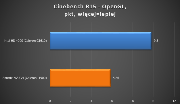 Cinebench to program syntetyczny badający wydajność procesora oraz karty graficznej. W naszym przypadku Celeron J1900 osiągnął poziom procesorów mobilnych ze średniej półki. Natomiast GPU nieco ustępuje zintegrowanej w procesorach Intela HD4000.