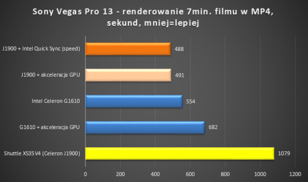 Sony Vegas to bardzo popularny program do renderowania filmów. Obserwujemy w nim bardzo interesujące wyniki. Na „sucho” dwurdzeniowy procesor G1610 poradził sobie znacznie lepiej z powierzonym mu zadaniem niż G1900. Procesor zamontowany w Slim PC obsługuje także technologię Intela – Quick Sync. Użycie tej funkcji znacząca (ponad dwukrotnie) skraca czas renderowania. Nieco gorsze wyniki obserwujemy przy włączeniu akceleracji GPU. Procesor G1610 nie obsługuje Quick Sync, ale nic nie stoi na przeszkodzie, by włączyć akcelerację GPU. Niestety na dwurdzeniowym procesorze przynosi to więcej szkody niż pożytku.