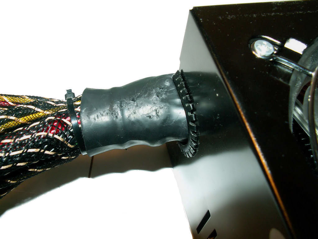 Niestety podczas pierwszych prób zdjęcia obudowy zrozumiałem dlaczego wstawili ten tekst, że tylko wyszkolony personel może to zrobić… ze zdjęciem tego męczyłem się około 5 minut… przeszkadzał początek oplotu kabli wykonany z gumy miał on zgrubienie i trzeba było go mocno odchylić żeby obudowa zeszła… no i chyba nie tylko ja miałem z tym problem (zaznaczam, że zasilacz wcześniej miało kilka redakcji w Niemczech), a skąd ta pewność? Sami popatrzcie…